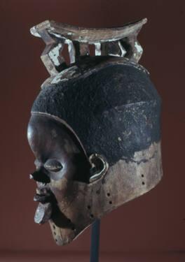 Label TextThis mask, part of a trio, represents a warrior and is danced by members of the Babende initiation society at funerals of its members. The projecting eyes are said to resemble those of a chameleon, with holes surrounding that allow the wearer limited vision as he (always a male) dances. The cheek stripes are said to be “mournful tears” shed at the funeral honoring a deceased society member. Feathers that decorated the top of the mask are missing, as is the elaborate costume of layered raffia cloth and the dance wands held in each hand. Ishyeen Maalu dances vigorously, with high kicks and expressive pantomime gestures down the village avenue and before the community elders and in front of the corpse of the deceased man.