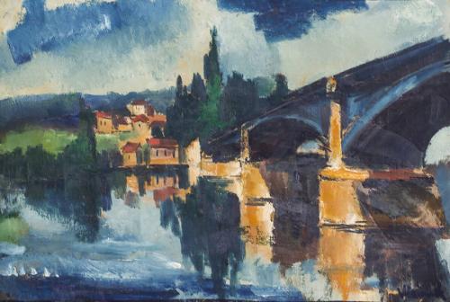 Not on viewLabel TextSelf-taught, Vlaminck's early work combined expressive, broad brushstrokes with the exuberant color of Fauvists such as Andre Derain and Henri Matisse, artists with whom he painted and exhibited. Following the 1907 Cezanne Retrospective held in Paris, Vlaminck fell under the spell of the recently deceased artist's palette, technique, and obsession with pure landscape. The Bridge is one such example, as seen in the more muted tones and constructivist brushwork of the composition, a decided turn away from the strident hues of the Fauves.