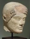On viewLabel TextThis head would have belonged to a standing nude sculpture of a young man which was about three quarters to half life-size. More commonly made of stone around Greece, terracotta kouroi were prevalent in southern Italy and Sicily. Sculpted to be viewed in the round, the distinct eyes of the archaic style in which they are carved ensures that their gaze is visible from many angles. Kouroi and their female (albeit clothed) equivalent, korai, have been excavated in cemeteries as well as sanctuaries, making their intended purpose unclear. They may have been offerings to the gods, or to the deceased, or they may be representations of either. It is possible their form was deliberately ambiguous and left up to the interpretation of the individual based on their context even in ancient times. A cream-colored clay slip remains on this head and, although there are no traces now, it is likely that he would have once been painted with different colors.